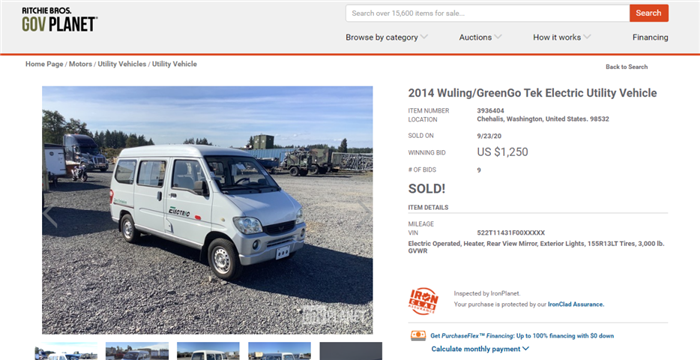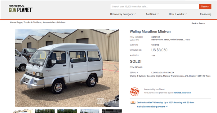国际在线报道(记者张倩楠颜观潮):当地时间9月23日下午,两辆五菱汽车在美国拍卖网站“GovPlanet”分别拍出1250美元(约合8511元人民币)、3050美元(约合20767元人民币)的价钱。