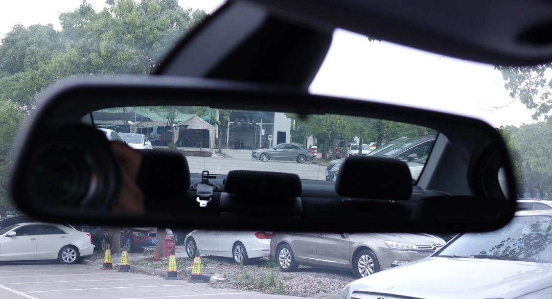 后视镜中的后排中间头枕挡住了大部分视线,介意了一路。