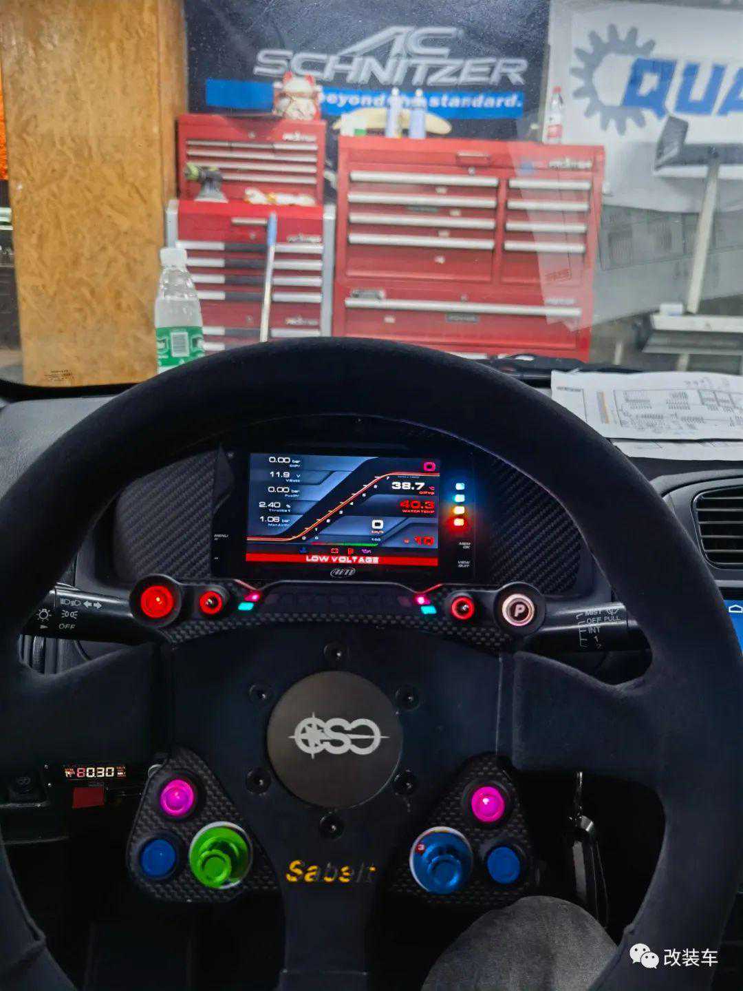 "内饰方面,换上了两张桶椅+Schorh4点式安全带、燃氪CAN多功能方向盘、快排、AIMMXP全取代赛车仪表,毫不马虎的内饰改装结合上出色的性能表现,仿佛是在开着一辆赛车。"