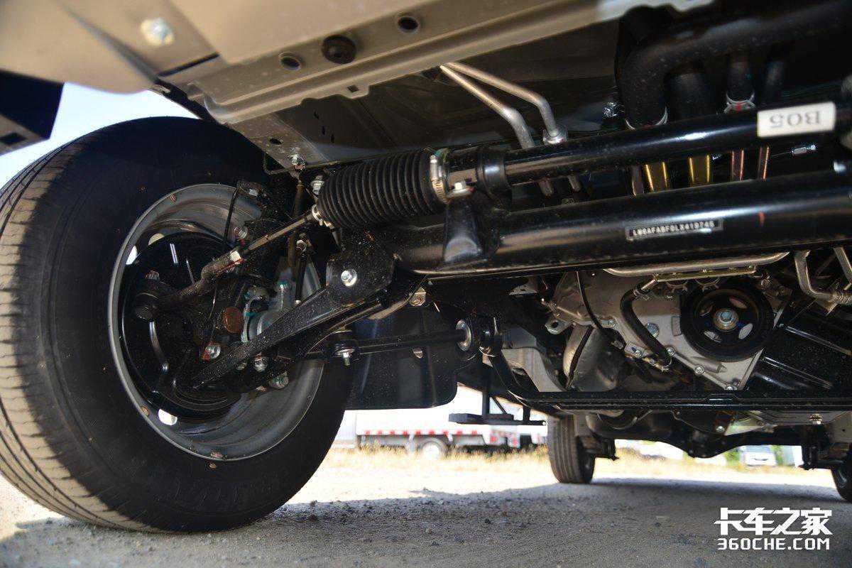 悬架结构方面,由于对承载力要求不高,因此前桥采用麦弗逊独立悬架,后桥为钢板弹簧整体桥,制动配置为前盘后鼓,兼顾制动性能和车辆成本。