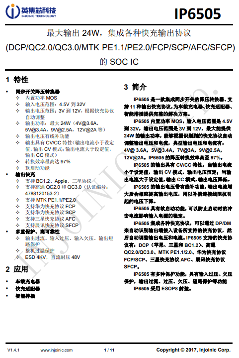 英集芯IP6505是一款集成同步开关的降压转换器、支持10种输出快充协议,为车载充电器、快充适配器、智能排插提供完整的解决方案。