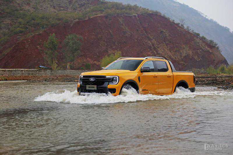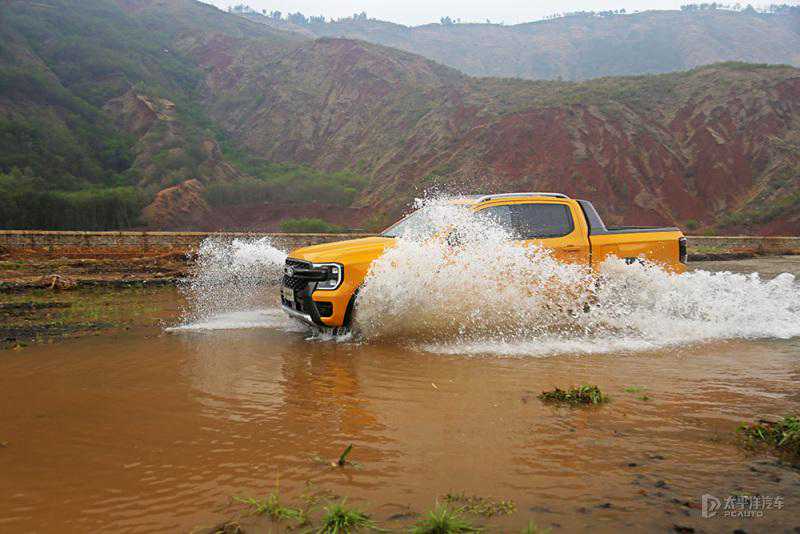 这里的河床被河流冲出了复杂的水冲沟,而且我们来时刚下过雨,河水深度和流速都很快。不过游骑侠Ranger很轻松地涉水。它的涉水深度800mm,进气口在右侧大灯旁边进气格栅顶端。如果加装涉水喉,那就更不用担心了。