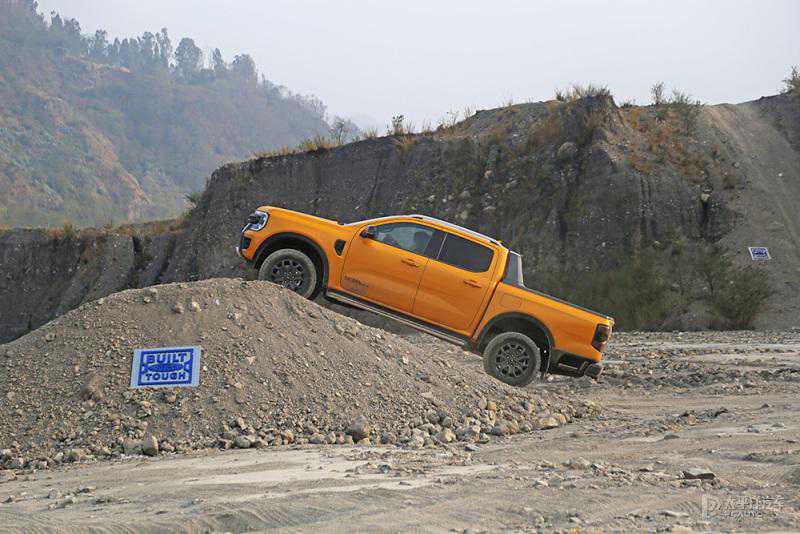 应对深炮弹坑以及驼峰路、30°侧倾斜坡、水冲沟时,游骑侠Ranger的表现也非常轻松。在30°侧倾斜坡上,车身稳定性很高,当车辆即将驶出出现后轮单侧悬空时,我试了一下车门可以轻松开关,说明车身的抗扭刚性足够高。