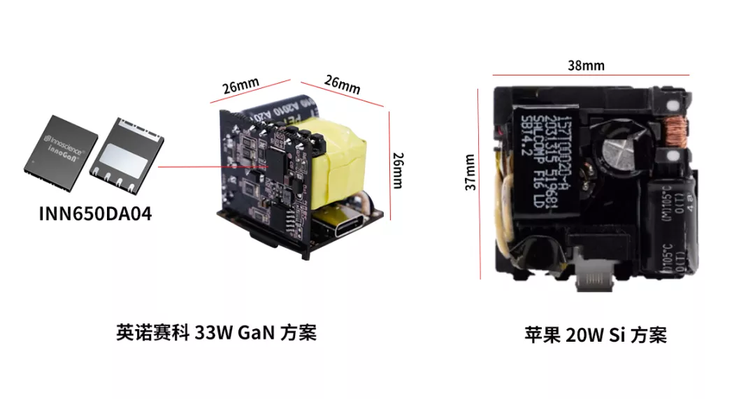 2021上半年,英诺赛科重点布局了33W氮化镓快充产品,推出高性价比氮化镓功率器INN650DA04。英诺赛科33W氮化镓快充方案在体积方面已有了巨大突破,PCB尺寸仅为26mm*26mm*26mm,功率密度可达1.88W/cm³,该功率器件也获得了广大快充电源青睐,出货量稳步增长。